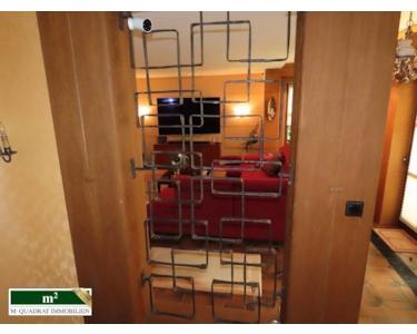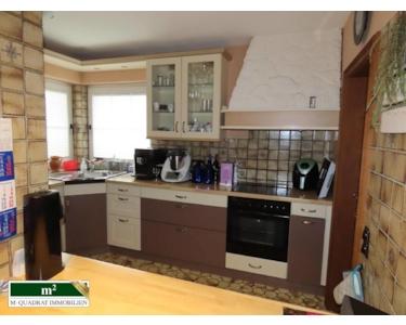 An den Eingangs- schließt sich der großzügig gestaltete Wohnbereich mit Küche, im halbrunden Erker gelegen Essensecke, Kamin- und Wohnzimmer an. Durch eine Öffnung in das I.OG und den dadurch entstehenden Luftraum ist dieses sehr hell und luftig. Im gesamten EG finden sich große Bodenfliesen aus rustikaler Keramik, handgeformte flämische Keramikfliesen und rustikale sandgestrahlte Eichenbalken, z.T. mit schmiedeeisernen Elementen verziert.