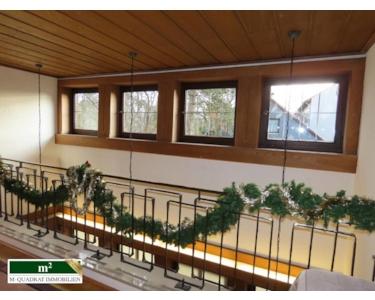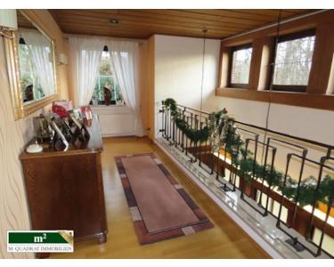 Das freistehende EFH mit EL-Wohnung besticht durch seine architektonische Bauweise. Es wurde im Jahre 1980 in solider Bauweise errichtet. Durch den anmutigen Treppenturm sind die beiden Hauseingänge voneinander getrennt. Der Eingangsbereich ist mit Treppenstufen in Travertin angelegt. Die Türanlage besteht aus massivem Eichenholz mit Butzenverglasung. Der links gelegene Eingangsbereich des Hauptteils ist durch Einbaumöbel und Garderobeneinbauten in rustikalem Charakter geprägt. Zur rechten Seite befindet sich die Gäste-Toilette.