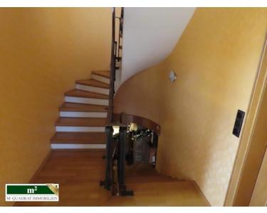 Über eine massive halbgerundete Stahlbetontreppe mit Holzbelag gelangt man sowohl in die Obergeschosse, als auch den z.T. wohnlich anmaßenden Keller.