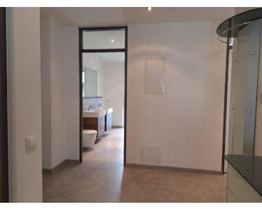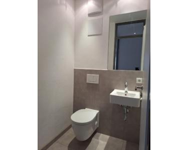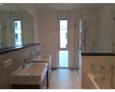 Das Badezimmer verfügt über eine Badewanne, eine Dusche mit Kabine, ein WC, zwei separate Waschbecken, einen großen Handtuchheizkörper und einen Waschmaschinenanschluss. Zudem besitzt die Wohnung ein kleines Gäste-WC mit Waschbecken.