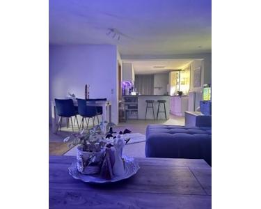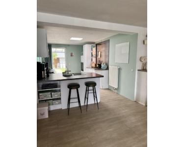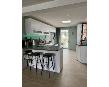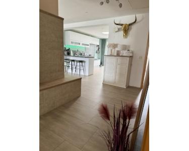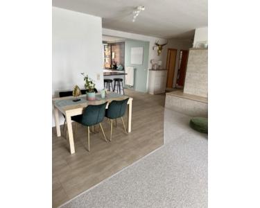 Der offene Wohn- und Essbereich wird durch große Fenster, der Terrassentür und einer nachträglich eingebauten Lichtkuppel im Dach (inkl. Industrielampe, die bei Bedarf zugeschaltet werden kann) wunderbar lichtdurchflutet.