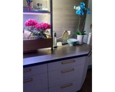 Der Neff-Slide-Backofen auf Arbeitshöhe, die Siemens-Spülmaschine inkl. timelight und die Samsung noFrost Kühl-/Gefrierkombination mit 2 seperaten FreshZonen unterstreichen die Hochwertigkeit. Gesamtwert der Küche ist über 16.000€.