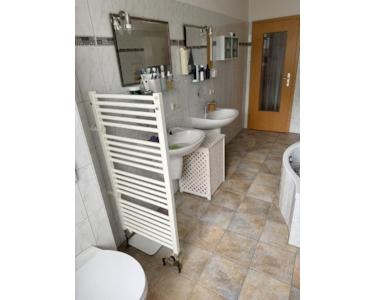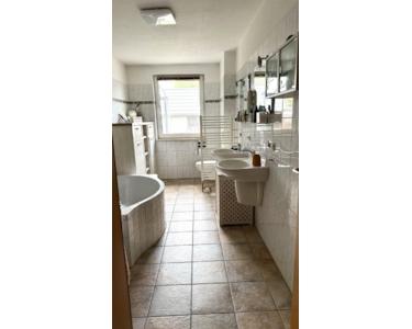 Das Badezimmer ist mit einem großem Fenster, 2 Waschbecken, einer komfortablen Badewanne, einem WC, einem Waschmaschinenanschluss sowie einem zusätzlichen Handtuchheizkörper ausgestattet.
