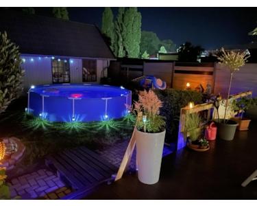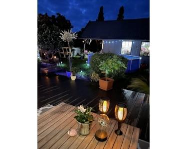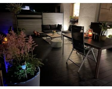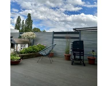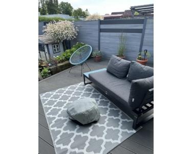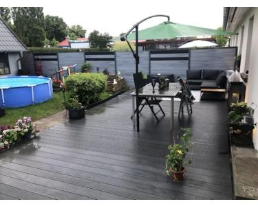 Die 2024 fertiggestellte BPC-Terrasse (44 qm) und eine Terrassenüberdachung erweitert die Nutzfläche im Freien enorm.