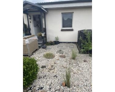 Im Vorgarten befindet sich ein angelegter Steingarten mit Schilfbesatz.