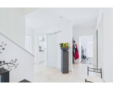 Auf rund 160 m² Wohnfläche erwartet Sie ein offenes Raumkonzept mit lichtdurchflutetem Wohn- und Essbereich sowie einer maßangefertigten, hochwertigen Einbauküche mit freistehender Kochinsel. Die Küche überzeugt durch edles Design, Marken-Elektrogeräte und durchdachte Funktionalität – auf Wunsch im Kaufpreis enthalten. Zusätzlich stehen im Erdgeschoss ein Gästezimmer, ein modernes Duschbad, ein Hauswirtschaftsraum und praktische Abstellflächen bereit.