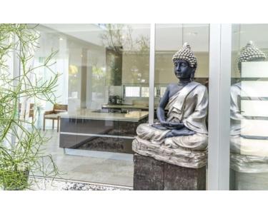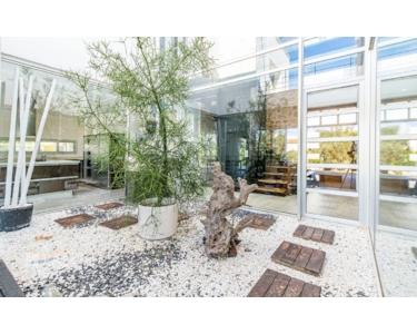 Im Erdgeschoss beeindruckt ein kleiner, verglaster japanischer Garten, der für eine besondere Atmosphäre sorgt. Zudem verfügt diese Ebene über ein offenes Wohnzimmer mit Kamin und direktem Zugang zur sonnigen Terrasse, eine voll ausgestattete Küche mit Kochinsel, ein helles Esszimmer, ein Schlafzimmer sowie ein Badezimmer.
