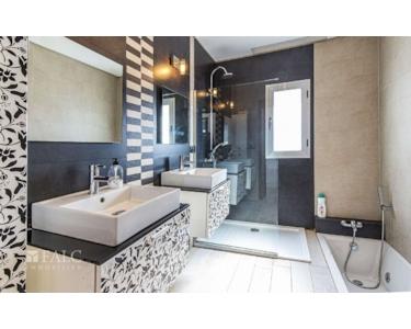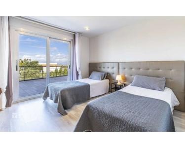Im ersten Obergeschoss befinden sich drei weitere Schlafzimmer, eines davon en suite mit eleganter Ankleide, ein zusätzliches Badezimmer sowie ein kleiner offener Aufenthaltsraum, der sich flexibel als viertes Schlafzimmer, Bibliothek oder Büro nutzen lässt. Alle drei Schlafzimmer sind durch eine Terrasse miteinander verbunden und bieten traumhafte Ausblicke bis zum Meer und zum Tramuntana-Gebirge. Dank der idealen Ausrichtung genießt man die Sonne vom Sonnenaufgang bis zum Sonnenuntergang, was der Villa eine besonders warme Atmosphäre verleiht.