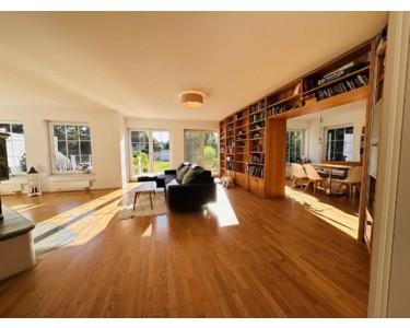 Über den repräsentativen Eingangsbereich mit großzügiger Diele und maßgefertigten Einbauschränken gelangen Sie in den lichtdurchfluteten Wohnbereich, der sich fließend in Ess- und Relaxzone gliedert. Ein stilvoller Kaminofen und edler Parkettboden mit Fußbodenheizung sorgen hier für ein behagliches Wohngefühl.