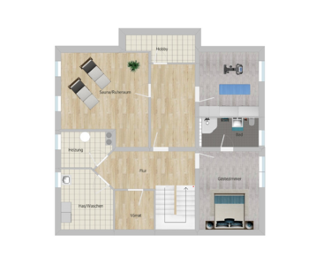 individuell nutzbare Zimmer, die vielfältige Wohn- oder Arbeitsmöglichkeiten eröffnen. Ein Gästezimmer ist hier zusätzlich mit einem hochwertigen „Bad en suite“ ausgestattet. Ergänzt wird dieser Bereich durch den Hauswirtschafts- und Heizungsraum sowie einen Vorratsraum. Dank der durchdachten Aufteilung ist hier sogar die Einrichtung einer separaten Einliegerwohnung denkbar. Momentan werden die Räume für Gäste und als Fitness-, Sport und Saunaraum genutzt.