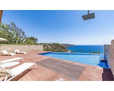 Der Außenbereich beeindruckt mit einem Salzwasser-Infinity-Pool mit Wassermassage, einer Außendusche, einem Grillplatz sowie einer großzügigen Terrasse, von der aus man den endlosen Blick auf das Meer genießen kann. Zur Ausstattung der Immobilie gehören doppelt verglaste Fenster, mallorquinische Blendläden, elektrische Rollläden, Parkett- und Marmorboden, Klimaanlage warm/kalt, Solarplatten, eine Osmose- und Entkalkungsanlage sowie Ölheizung. Eine Tiefgarage für bis zu drei Fahrzeuge rundet dieses außergewöhnliche Angebot ab.