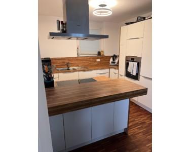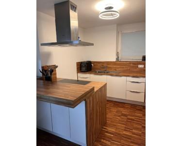 Wohn- und Esszimmer mit offener Küche mit hochwertiger Einbauküche inkl. Geräten.