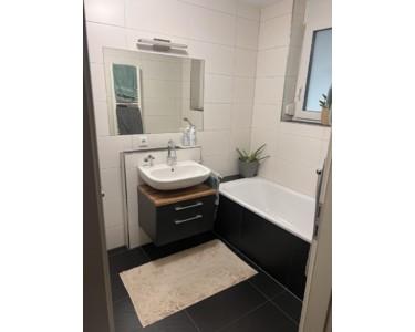 Freundlicher Eingangsbereich. Kleiner sehr praktischer Abstellraum. Gegenüber befindet sich das modern ausgestattete Bad mit Badewanne, Dusche, Toilette und Waschbecken sowie zusätzlichem Handtuchheizkörper. Großzügiges Schlafzimmer und ein Kinderzimmer.