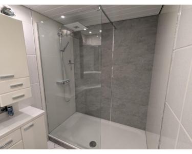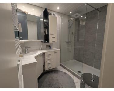 Die Wohnung ist mit einer hochwertigen modernen Einbauküche ausgestattet und verfügt über ein Badezimmer mit Walk-In-Dusche sowie Regenduschkopf.