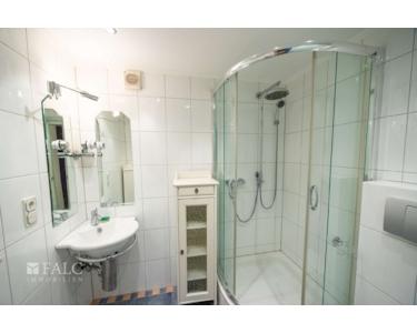 Das Badezimmer präsentiert sich hell und zeitlos: freundliche Fliesen, weiße Sanitärelemente und eine moderne Duschkabine schaffen einen Ort, an dem der Tag entspannt beginnt und ebenso ruhig endet. Der helle Fliesenboden zieht sich durch die gesamte Wohnung und sorgt für ein ruhiges, einheitliches Gesamtbild.