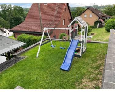 Ein großer Garten mit Schaukel, Trampolin, Sandkasten und Rutsche lädt Kinder zum Spielen und Toben ein. Gartenfreunde dürfen sich über gepflegte Hochbeete freuen – perfekt für den eigenen Gemüse- oder Kräuteranbau.