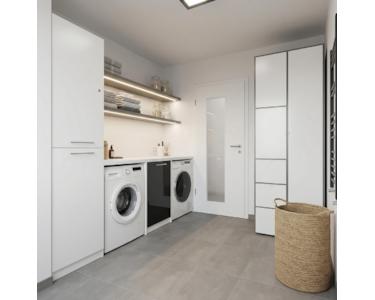 Im Erdgeschoss befinden sich ein Gäste-WC mit Dusche, ein großzügiger Haustechnikkeller (HWR) mit Waschmaschine und Trockner sowie eine Abstellfläche. Die Küche ist exklusiv ausgestattet mit nagelneuen Geräten. Das Wohnzimmer wirkt offen und lichtdurchflutet. Von hier aus gelangen Sie zur Terrasse, die einen kleinen, ausschließlich nutzbaren Gartenbereich umfasst.