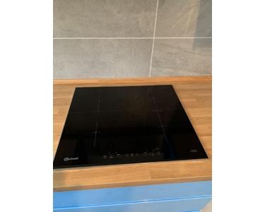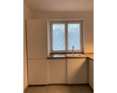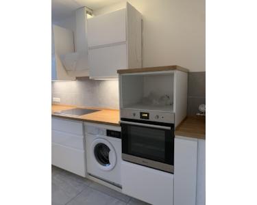 Die Küche wurde mit einer modernen L-förmigen Einbauküche ausgestattet, die neben reichlich Stauraum auch hochwertige Elektrogeräte umfasst: Eine Geschirrspülmaschine, Waschmaschine, Induktionsherd, Abzugshaube und ein kombinierter Kühl- und Tiefkühlschrank sind bereits eingebaut. Die vielen Schränke und Regale bieten praktischen Stauraum und eine gut organisierte Arbeitsfläche.