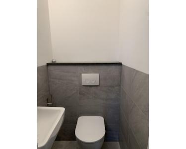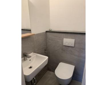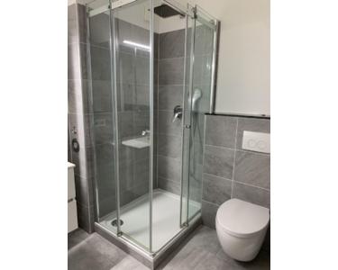 Das Badezimmer erstrahlt in neuem Glanz mit einer modernen Glasduschkabine, einem stilvollen, möblierten Waschbecken sowie einem wandhängenden WC mit hochwertigen Armaturen. Ein elektrischer Abluftventilator sorgt in beiden Badezimmern für eine gute Luftzirkulation.
