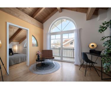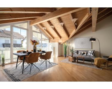 Bereits beim Betreten empfängt Sie – insbesondere bei geöffneten Flügeltüren – das lichtdurchflutete Herzstück der Wohnung: der großzügige Wohn- und Essbereich. Großflächige, bis unter das Dach reichende Fensterfronten lassen die Räume im natürlichen Licht erstrahlen und schaffen ein unvergleichliches Raumgefühl. Die imposanten Dachschrägen verleihen dem Wohnraum eine besondere architektonische Note und unterstreichen seinen individuellen Charakter. Zusätzlich führen bodentiefe Fenster auf gleich drei Balkone in Süd-Ost-, Süd-West- und Nord-West-Ausrichtung – ideal, um zu jeder Tageszeit Sonne, Weitblick und das beeindruckende Alpenpanorama zu genießen.