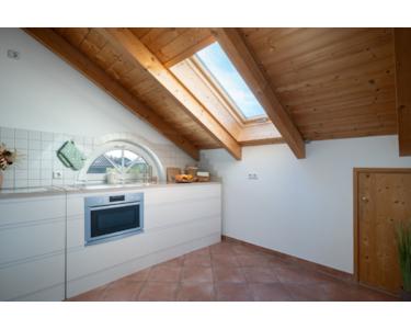 Die Küche fügt sich nahtlos in den Wohnbereich ein und kann bei Bedarf durch eine elegante Tür abgetrennt werden. Ein großes Dachfenster – nach Südwesten ausgerichtet, und ein weiteres Fenster nach Osten ausgerichtet – schaffen eine helle, angenehme Atmosphäre und ideale Bedingungen zum Kochen.
