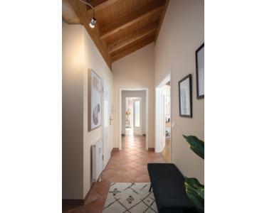 Buchenparkett in Wohn- und Schlafräumen sorgen für eine warme, harmonische Wohnatmosphäre, während der Flur- und Küchenbereich mit Terracottafliesen mediterrane Akzente setzt und den hellen Räumen eine zeitlose Eleganz verleiht.