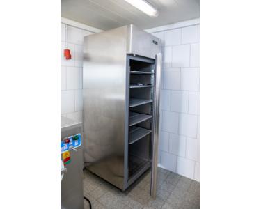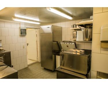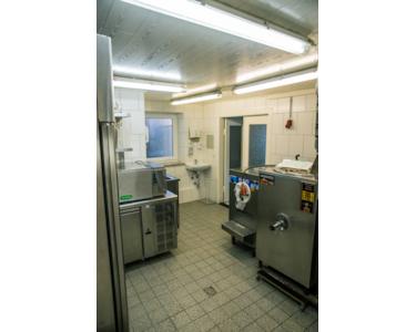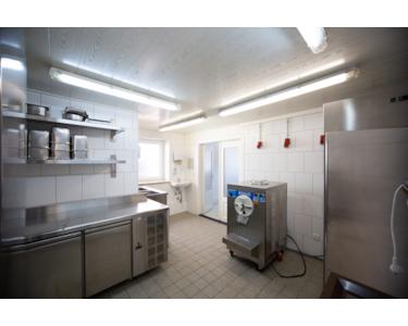 Nicht für die Gäste zugänglich befindet sich nach hinten heraus, eine große Küche mit Waschmaschine, ein Personalduschbad sowie die Eisproduktionsfläche mit den entsprechend notwendigen hochwertigen Maschinen aus Italien sowie die nötigen Kühlschränke.