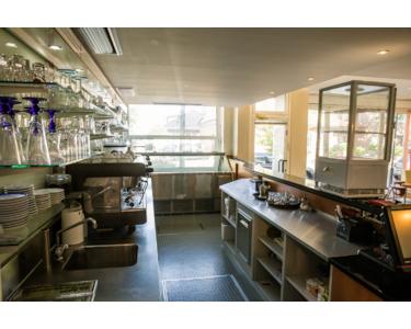 Die Fensterfront läßt sich öffnen, sodass direkte Verbindung zwischen Café und Außenbereich besteht.
