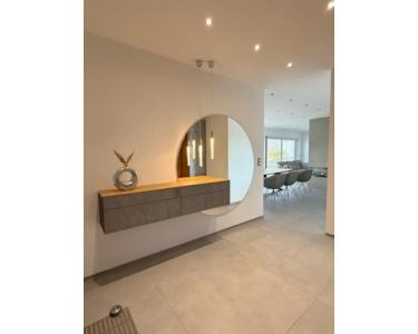Platz für Jacken, Schuhe und Accessoires, alles ordentlich verstaut, Großer runder Spiegel mit Lowboard mit Schieferfronten