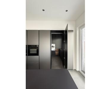 Schranksystem Ballerina, sehr viele Schränke mit Schubladensysteme und Regalböden, Deckenhoch, viel Platz für Stauraum, Liebherr Kühlschrank, Keramik Arbeitsplatte mit Einbauspüle und Mülltrennsystem