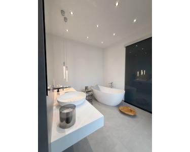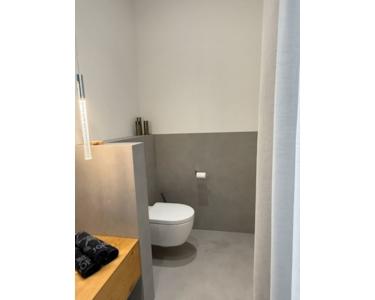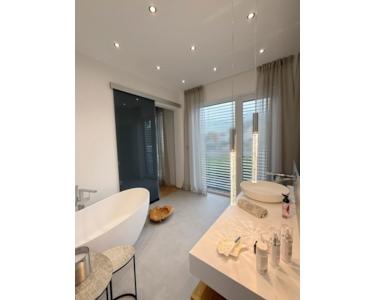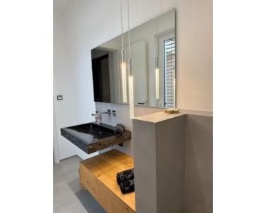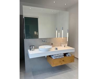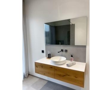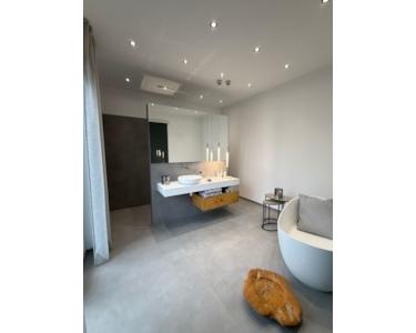 in allen Bädern sind edle Möbel in maßanfertigtem Massivholz Wildeiche mit Push-to-open Softlose System, mit Aufsatzwaschbecken, Amaturen von Hans Grohe, Grohe, in den Duschen sind ebenfalls italienische Großvormatfliesen verlegt, im Gäste WC mit Granit Wachtisch