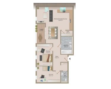 Diese elegante Dachgeschosswohnung überzeugt durch ihren offenen Wohn- und Essbereich, der mit viel Licht durchflutet wird und direkten Zugang zur Loggia bietet. Der angrenzende Abstellraum und die Garderobe bieten praktischen Stauraum, und von der Garderobe aus gelangen Sie in das Gäste-WC, das ebenfalls geschmackvoll und funktional gestaltet ist.