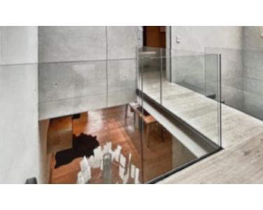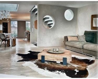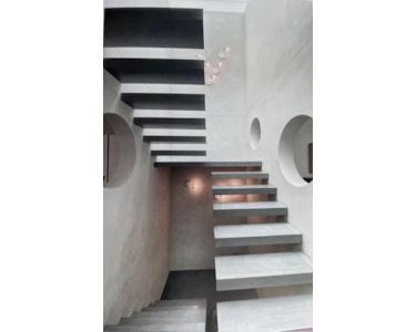 Verbindende Elemente der drei Ebenen ist eine skulpturale, wie schwebend erscheinende Design-Kragarmtreppe aus Sichtbeton, handgehobelte, gekalkte Eichen-Echtholzdielenböden sowie Wände in Sichtbetonoptik. Dieser gekonnte Einsatz von kühleren Nichtfarben und warmen Naturmaterialien machten den besonderen Reiz des Hauses aus. Weitere verbindende Design-Elemente sind die im ganzen Haus eingesetzten Le Corbusier Licht-, Jalousie- und Tastschalter.