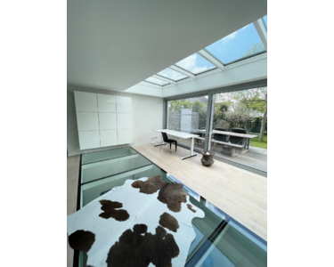 Der Living-Bereich im Erdgeschoss vereint Wohnen, Essen, Kochen und ein, bei Bedarf abtrennbares Homeoffice im Wintergarten. Auf dieser Ebene bietet sich ein faszinierendes Wechselspiel aus stehenden, integrierten und schwebenden Elementen. Eine Bulthaup Kochinsel, ein amerikanischer Kühlschrank, Miele Einbaugeräte sowie maßangefertigte Hochglanz-Einbaumöbel sind „State of the Art“.
