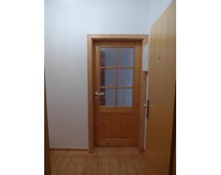 Böden: massive frisch abgeschliffene Weichholzdielen, neue Kieferntüren, die Decken und Wände sind mit Raufaser tapeziert und weiß gestrichen.