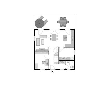 wäre bei Krankheit oder im Alter auch das Wohnen auf einer Etage möglich. Der Wohn-/Ess-/Kochbereich ist mit vier großen Terrassentüren ausgestattet und bietet viel Platz für die Familie. Die geradläufige Treppe strahlt Struktur und Modernität aus.