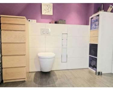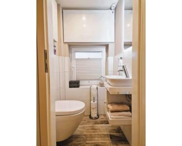 Sie finden in diesem Bereich ein ansprechendes Gäste-WC vor; die Wände dort sind ca. 1,20 Meter-hoch gefliest.