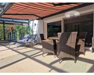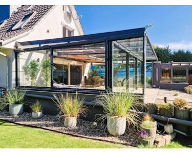Im Anschluss an das Erlebnis "Wohnzimmer": der vorgelagerte Wintergarten (Kalt-Wintergarten). Ein einziger Traum. Großzügig. Durchdacht. Sichtgeschützt. Und zusätzlich noch mit einer schützenden Markise versehen. Wir sehen tatsächlich Vieles. So etwas nicht aller Tage. Natürlich auch hier: LED-Einbauten.