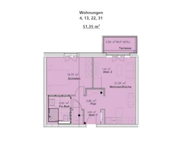 Das Angebot bezieht sich auf die Wohnung 3 im Erdgeschoß. Von der zentralen Diele mit Garderobe/Abstellraum gelangen Sie in den hellen Wohn/Eßbereich mit offener Küche von ca. 23 m² mit Ausgang auf die schöne sonnige Terrasse Dem Kochbereich ist ein sinnvoller Abstellraum zugeordnet Gleichermaßen sind das geräumige Schlafzimmer von ca. 13 m²sowie das Duschbad von ca. 5 m² von der Diele erreichbar. Die Wohnung hat eine Wohnfläche von ca. 50 m². Die Wohnung ist barrierefrei