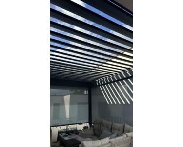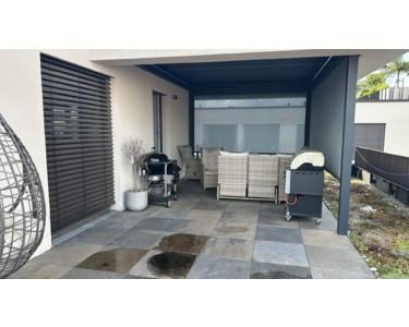 Der große Hauptbalkon hat eine elektrische Bedachung mit seitlichen Sonnenschutzwänden. Dach und Sonnenschutzwände lassen sich per Fernbedienung öffnen bzw. schließen. Die Bedachung ist Regen/Winterfest.