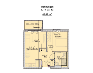 Das Angebot bezieht sich auf die Wohnung 5 im Erdgeschoß. Von der zentralen Diele mit Garderobe/Abstellraum gelangen Sie in den hellen Wohn/Eßbereich mit offener Küche von ca. 20 m² mit Ausgang auf die schöne sonnige Terrasse. Dem Kochbereich ist ein sinnvoller Abstellraum zugeordnet Gleichermaßen sind das geräumige Schlafzimmer von ca. 13 m² sowie das Duschbad von ca. 5 m² von der Diele erreichbar. Die Wohnung hat eine Wohnfläche von ca. 46 m². Die Wohnung ist barrierefrei