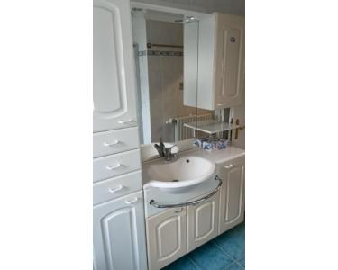 Ober- und Unterschrank inklusive Spiegel sowie WC ausgestattet.