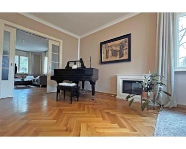 Diese denkmalgeschützte Villa verfügt über sieben schöne Zimmer sowie zwei ansprechende Wohnzimmer, die mittels einer Schiebetür zu einem großzügigen Salon erweitert werden können. Hier befindet sich auch ein offener Kamin. Es gibt zwei Badezimmer
