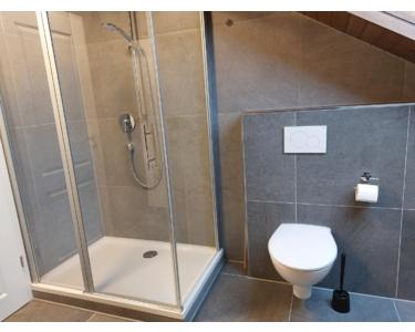 • Neuwertige Sanitärausstattung, bestehend aus einer geräumigen Dusche mit Duschtrennwand, Wand-WC spülrandlos, Waschbecken, Spiegelschrank und Badezimmerschrank.