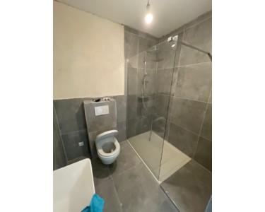 Modernes, neu saniertes Bad mit begehbarer Dusche und großformatigen grauen Fliesen