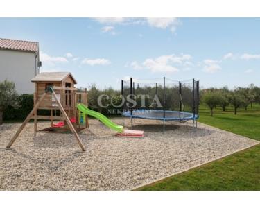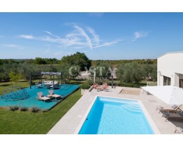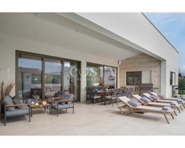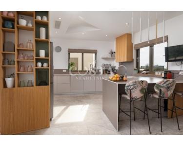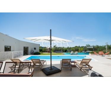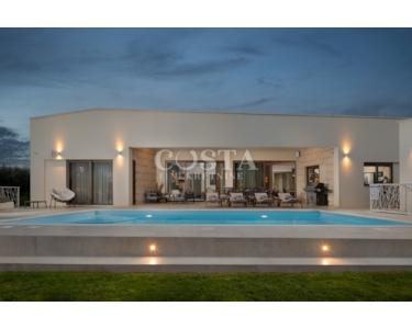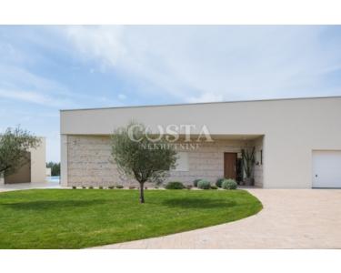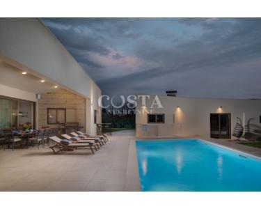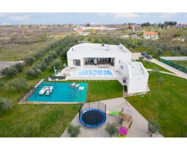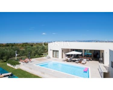 In Smoković bei Zadar steht eine luxuriöse, modern eingerichtete Villa mit Pool zum Verkauf. Die ebenerdige Villa mit einer Wohnfläche von 235,27 m² befindet sich auf einem großzügigen Grundstück von 3030 m². Sie besteht aus einem Haupt- und einem Nebengebäude. Das Hauptgebäude verfügt über ein geräumiges Wohnzimmer, eine offene Küche mit Essbereich, vier Schlafzimmer mit jeweils eigenem Bad, ein Gäste-WC, einen Abstellraum, einen Wintergarten und eine Garage. Auf der überdachten Terrasse befindet sich ein Esstisch, und im Innenhof erwarten Sie ein Swimmingpool, eine Liegewiese und ein Kinderspielplatz.