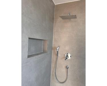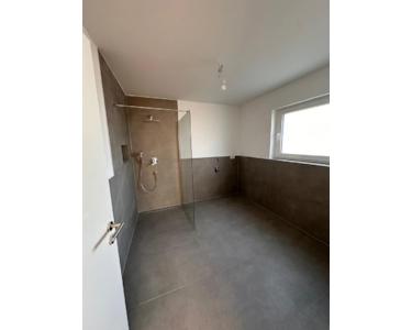 Badezimmer: Das Tageslichtbad ist ein Highlight. Große, moderne Fliesen in Betonoptik, eine bodengleiche Walk-In-Regendusche mit Glaswand und eine praktische Nische in der Dusche unterstreichen den Wellness-Charakter. Ein separates Gäste-WC im gleichen Design ist ebenfalls vorhanden.