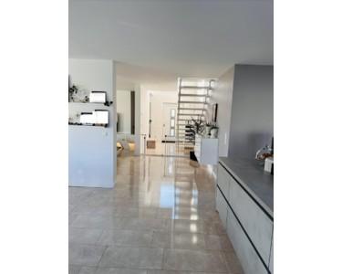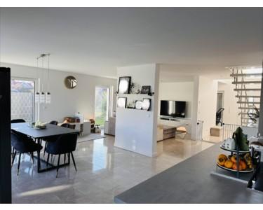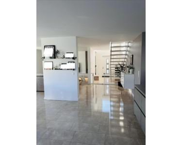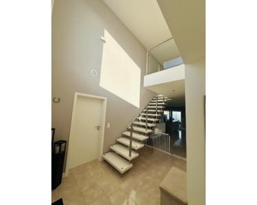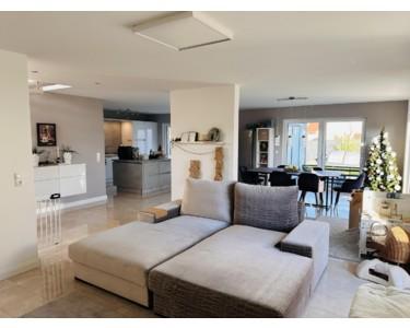 Der offen gestaltete Wohnbereich vereint Küche, Essen und Wohnen zu einem lichtdurchfluteten Mittelpunkt des Hauses. Die hochwertige Küche mit Kochinsel fügt sich perfekt in das moderne Wohnkonzept ein. Der Galeriebereich im Eingangsbereich sowie die Treppe aus echtem Stein mit Glasgeländer unterstreichen den exklusiven Charakter der Immobilie.