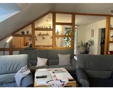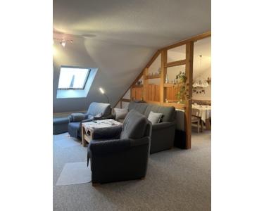 Diese helle 2-Zimmer Dachgeschosswohnung mit ca. 78 m² Wohnfläche befindet sich in Großenseebach. Die Wohnung verfügt über einen großen und voll überdachten Balkon mit Markise, der zum Entspannen einlädt, sowie eine ausgestattete Küche, die allerdings ein bisschen in die Jahre gekommen ist. Ein Keller mit ca. 20qm Nutzfläche bietet zusätzlichen Stauraum. Im Haus befindet sich darüber ein separater Waschkeller und Trockenraum. Die Wohnung wird ab dem 31.01.2026 verfügbar sein. Die Innenausstattung ist normal und teilweise renovierungsbedürftig (Teppichböden). Mit Zustimmung der anderen Eigentümer, würde ein Dachboden zum Ausbau zur Verfügung stehen.