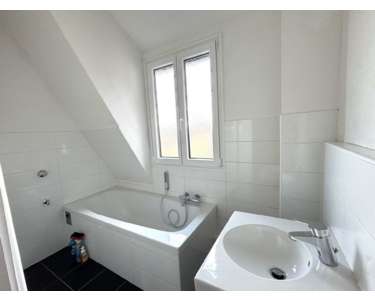 Das frisch renovierte Badezimmer überzeugt mit einer Badewanne, einem praktischen Handtuchheizkörper und einem Waschmaschinenanschluss. Moderne Armaturen und stilvolle Fliesen runden das elegante Erscheinungsbild ab.